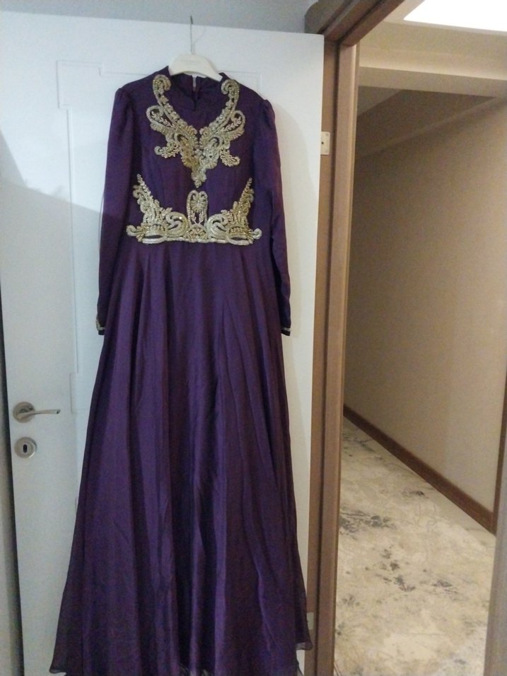 Uzun mor renkte, yüksek yakalı ve uzun kollu, nakışlı ve drapeli, tesettür tarzında abiye elbise. Düğünler için uygun.