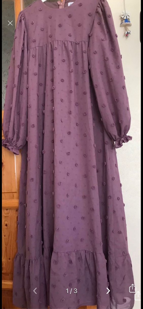 Uzun, mor renkte nakışlı ve fırfırlı detaylara sahip elbise. Uzun kollu, kayık yaka ve bol kesimle bohem tarzda. Yumuşak sentetik kumaştan, günlük kullanıma uygun. Az giydim. Deformesi yok.