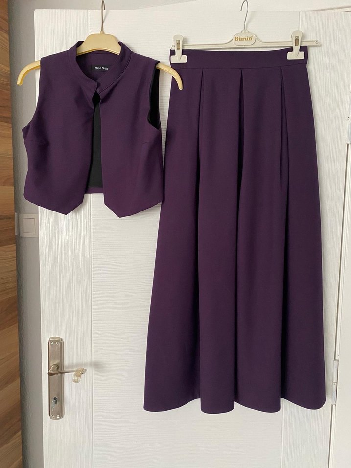 Kadınlar için uzun pileli etek ve kolsuz, yaka detaylı üstten oluşan mor takım. İpeksi kumaştan, regular fit, ofis için uygun minimal ve normcore stil.