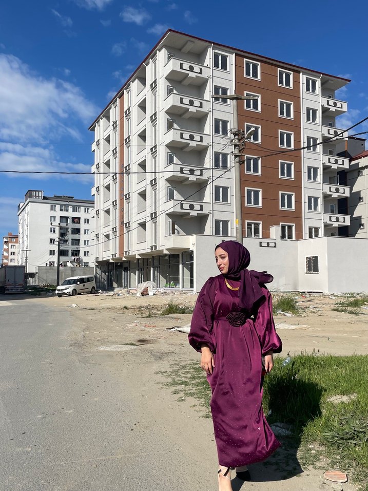 Bu uzun mor elbise, salaş kesimi, drapeli detayları, uzun kolları ve tekne yaka tasarımıyla dikkat çeker. İpek gibi kumaştan üretilmiş, günlük sokak modasına uygun mütevazı bir modeldir.