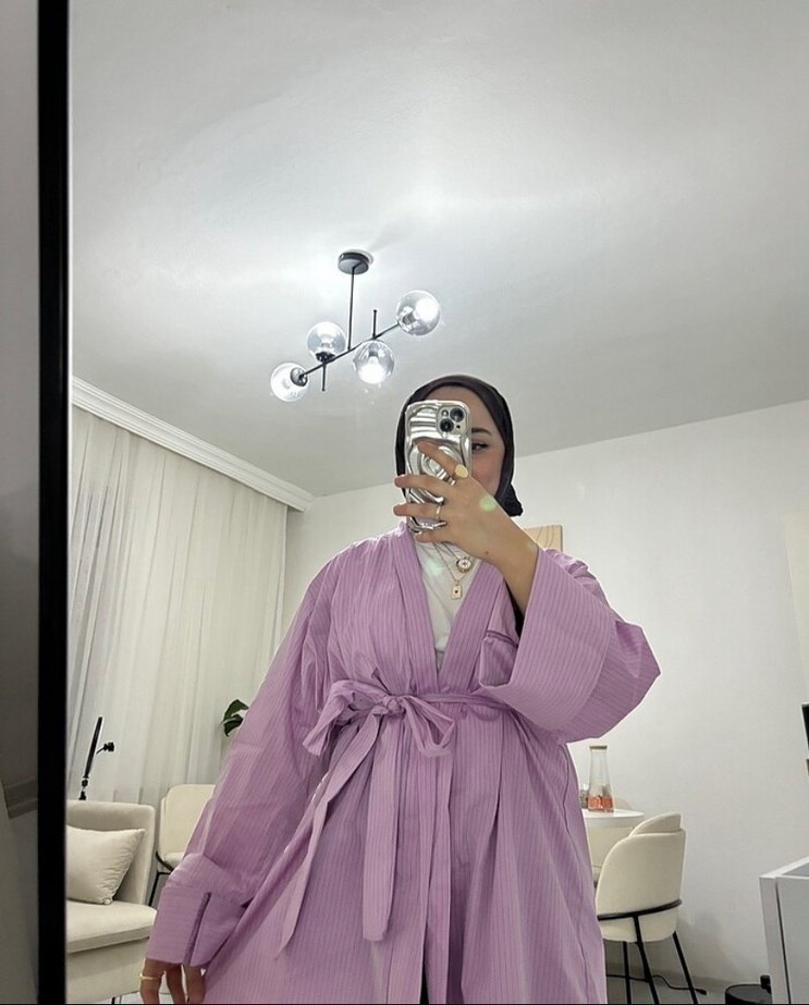 Uzun mor renkli, salaş kesim kimono. Yüksek yakalı, askılı kollu, yumuşak ve ipeksi kumaştan, transparan tie-dye desenli, günlük ve sade kullanıma uygun.