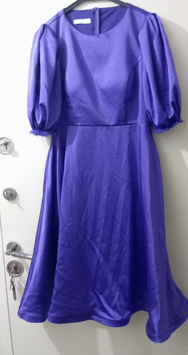 Parlak saten kumaştan, bol kesim uzun mor elbise. Kayık yaka ve uzun kollu, vintage goth tarzıyla düğünlere uygun. kısa kollu