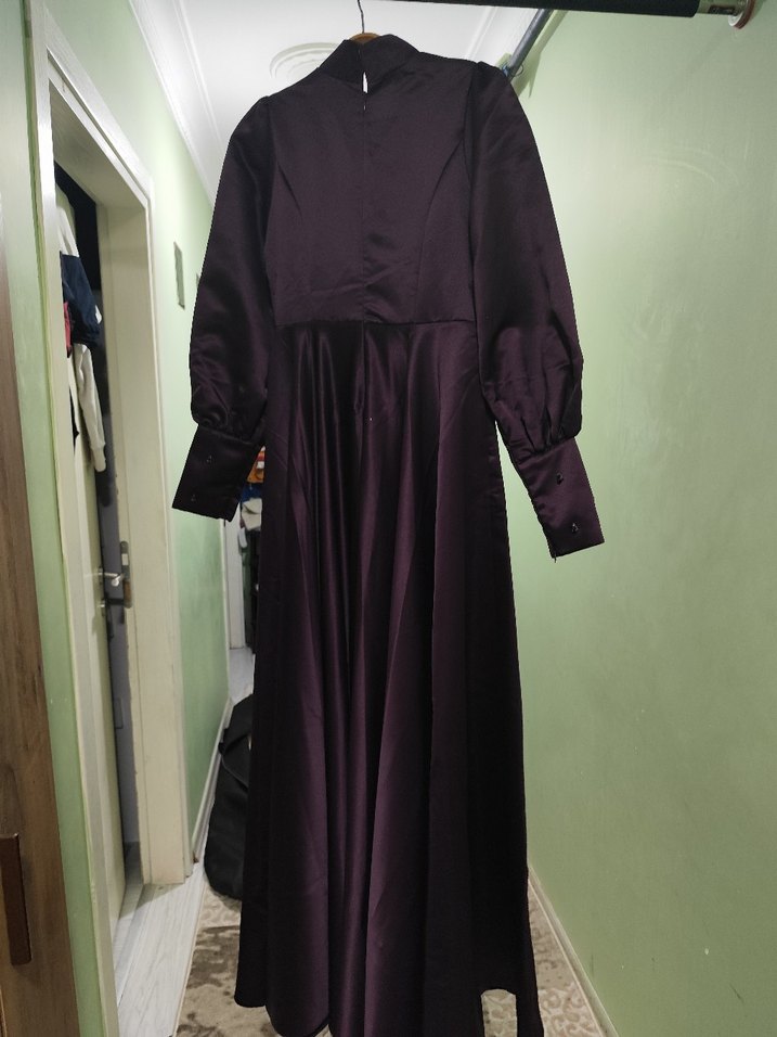 Uzun boy, koyu mor renkte, yüksek yakalı ve uzun kollu bol kesim elbise. Saten kumaştan, drapeli tasarıma sahip, ofis kullanımı için uygun. meliha tarhanaci markası abiye sıfır etiketli mağaza ürünü