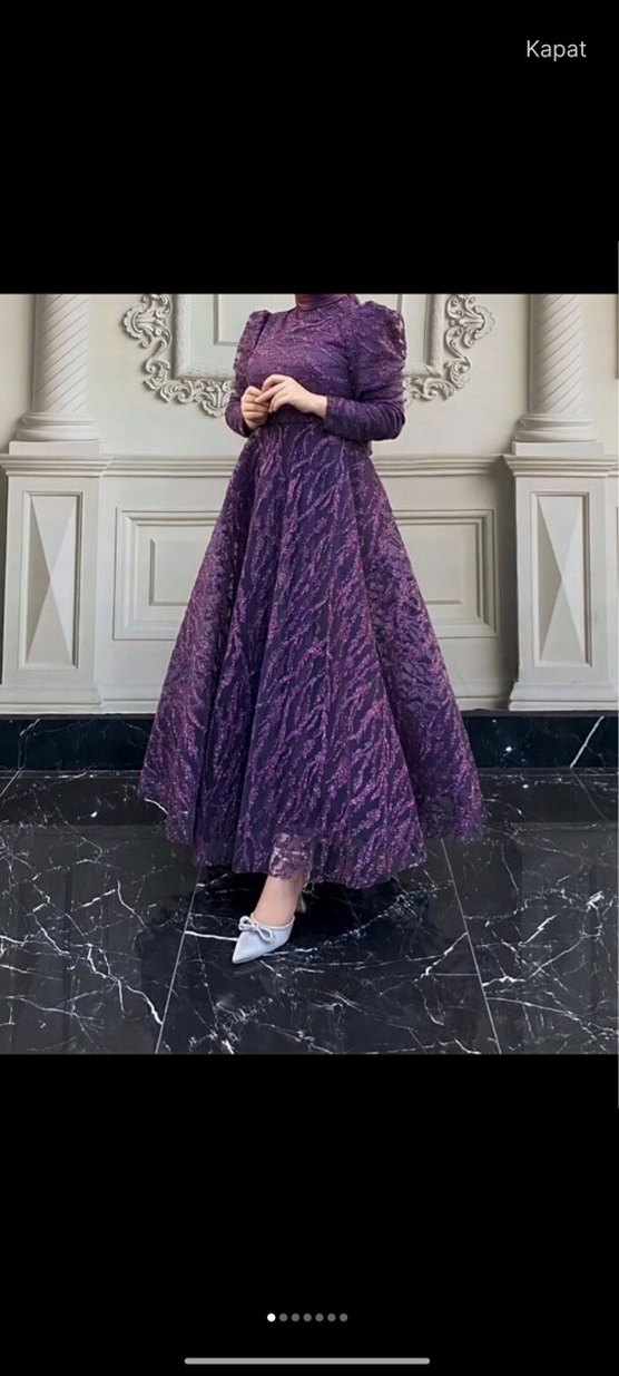 Uzun mor simli, batik desenli abiye elbise. Uzun kollu ve bol kesim klasik şıklık sunar. Sadece 1 kez giyildi.