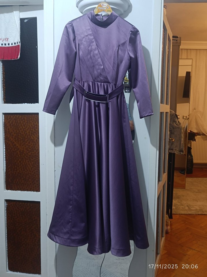 Uzun mor renkte, yüksek yakalı ve uzun kollu, drapeli tasarıma sahip, ipeksi kumaştan üretilmiş kadın tesettür abiye elbisesidir. Düzenli kesim ve tesettür tarzda düğünler için uygundur.