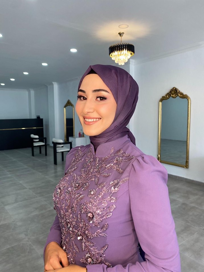 Yüksek yakalı, uzun kollu, etnik işlemeli mor uzun abiye elbise, tesettürlü ve gösterişli düğünler için uygundur.