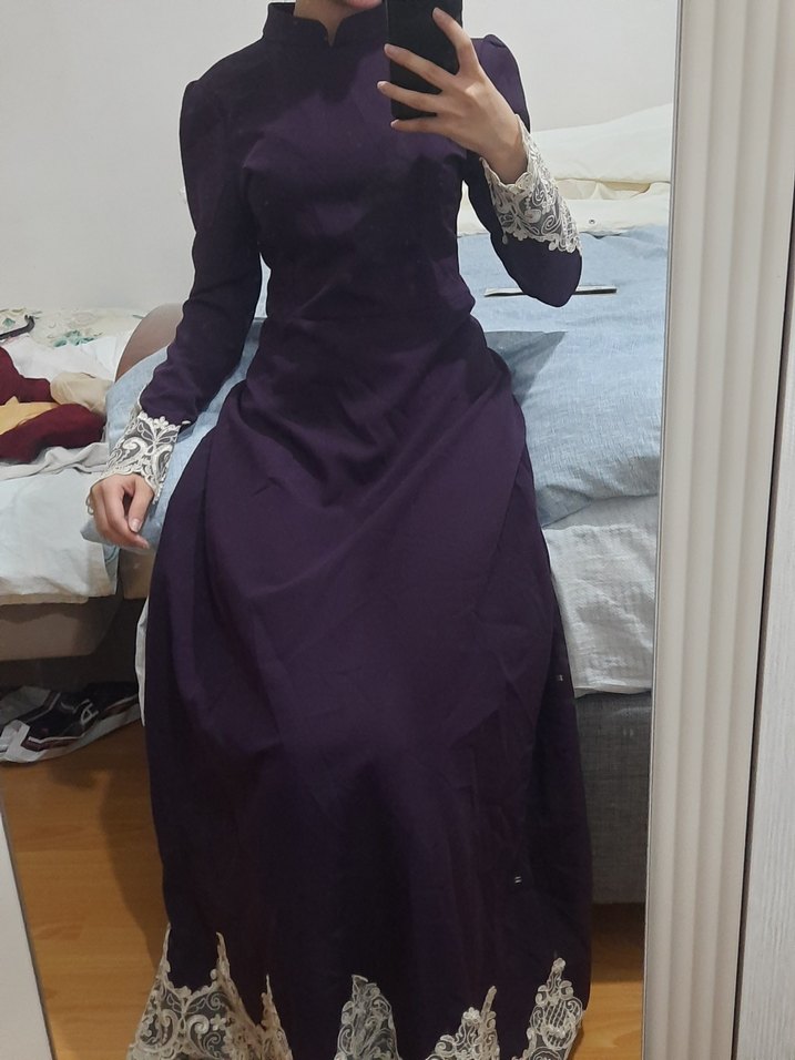 Bu mor uzun elbise, yüksek yakalı ve uzun kolludur.Uç ve kol uçlarında dantel detayları bulunur, düğünler için uygundur. Ben 38 beden giyiyorum belime hafif bol geliyo ama 38 beden için de olur.