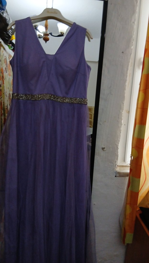 Uzun mor renkte, V yaka ve kolsuz, drapeli ve parlak kumaştan yapılmış, bel detayı olan klasik şıklıkta abiye elbise.