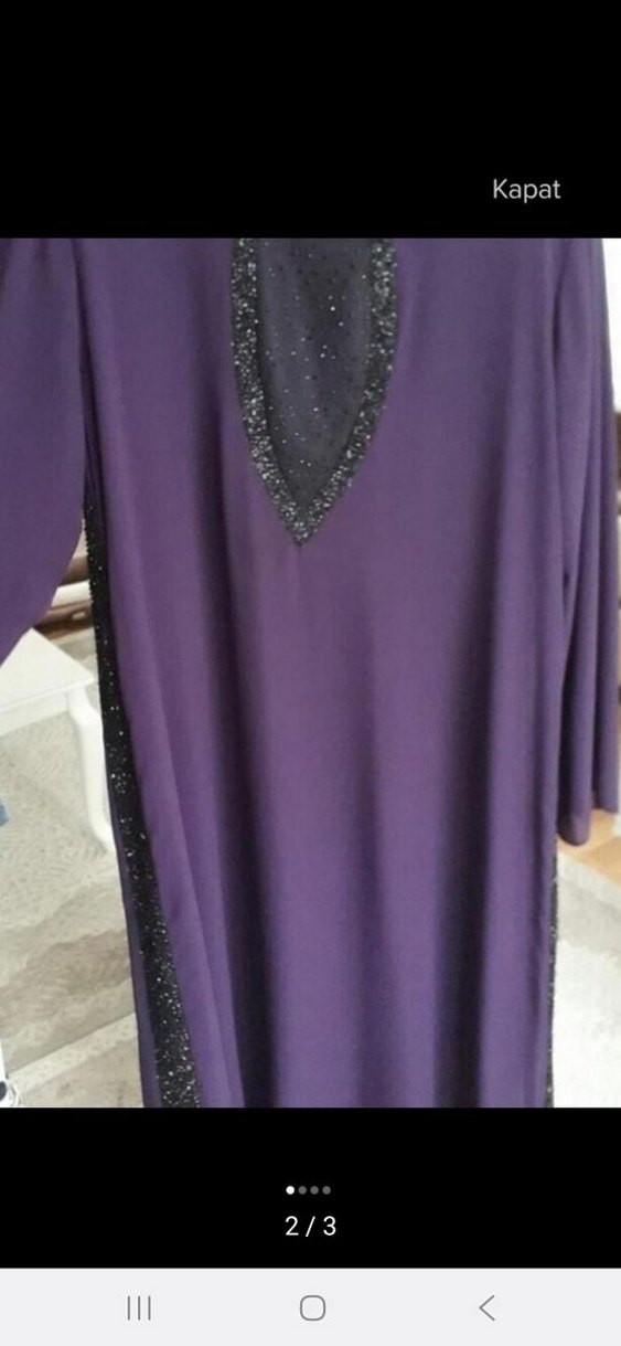 Uzun mor elbise, V yaka ve uzun kollu, dökümlü ve bol kesimdir. Yaka ve yanlarda ışıltılı detaylar bulunur. Romantik akşamlar için uygundur.