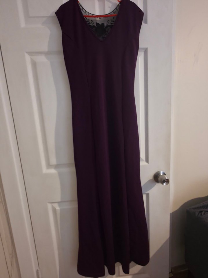 Uzun mor renkte, V yakalı ve kolsuz, drapeli detaylı, regular fit gotik tarzda elbise. Romantik akşamlar için uygun.