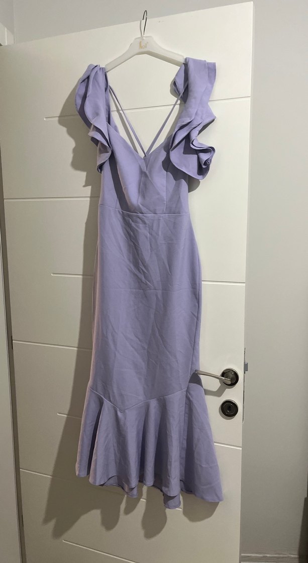 Uzun mor renkli, V yakalı ve askılı kollu abiye elbise. Fırfır detayları ile minimalist ve çağdaş bir tarz sunar.
