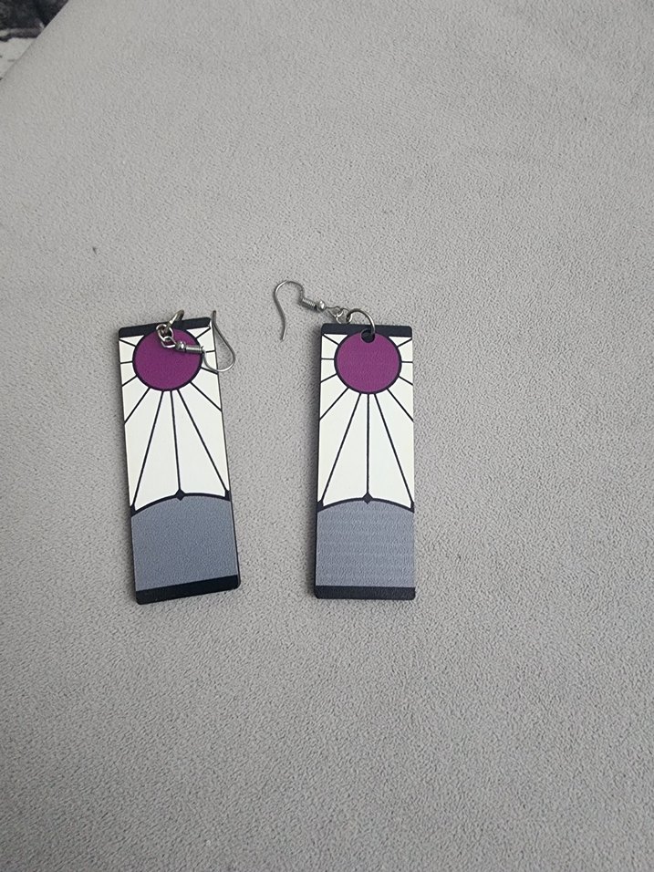Günlük kullanıma uygun, mor ve gri renkte, baskılı minimalist desenli, boncuk detaylı uzun küpeler.