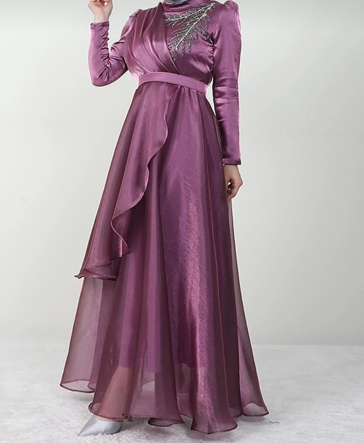 Uzun Mor Yüksek Yakalı Kadın Abiye Elbise