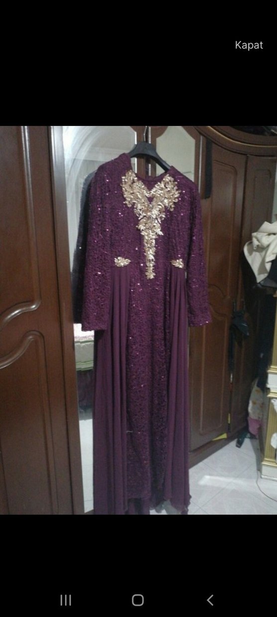 Uzun mürdüm abiye elbise, drapeli ve bol kesimdir. Uzun kollu ve V yakalı, işlemeli detaylara sahiptir. Düğün ve özel davetler için uygundur.