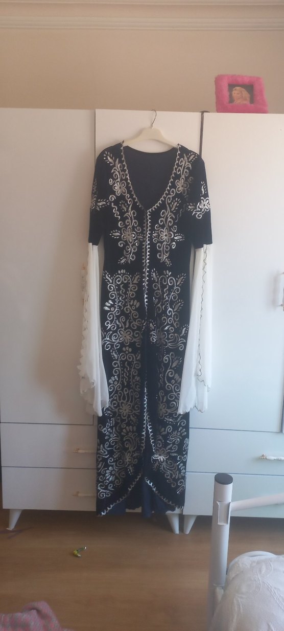 Uzun, bol kesim kadın elbisesi, koyu renk kumaş üzerine beyaz nakışlarla süslenmiştir. V yaka, uzun kollu ve drapeli bohem tarzındadır, düğün gibi özel anlara uygundur. #kınaelbisesi