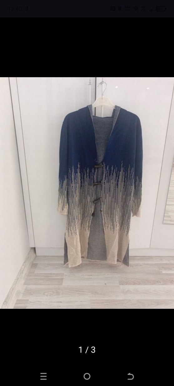 Bu uzun mavi örgü kadın hırka, bol kesim, uzun kollu ve batik desenlidir. Askısız yaka ve düğmeli kapama detaylarına sahiptir, rahat bohem tarz sunar.