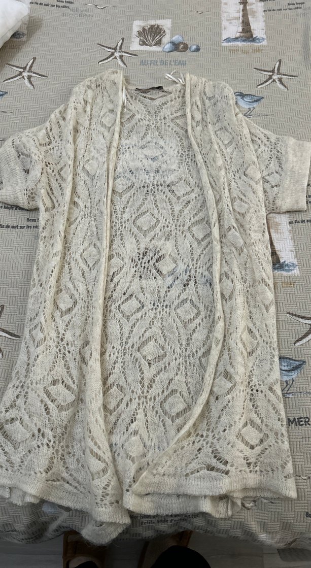Uzun, bol kesim, örgü beyaz kadın hırka. Düz, ince örme kumaş, uzun kollu ve yuvarlak yakalıdır. Rahat, bohem tarz için uygundur.