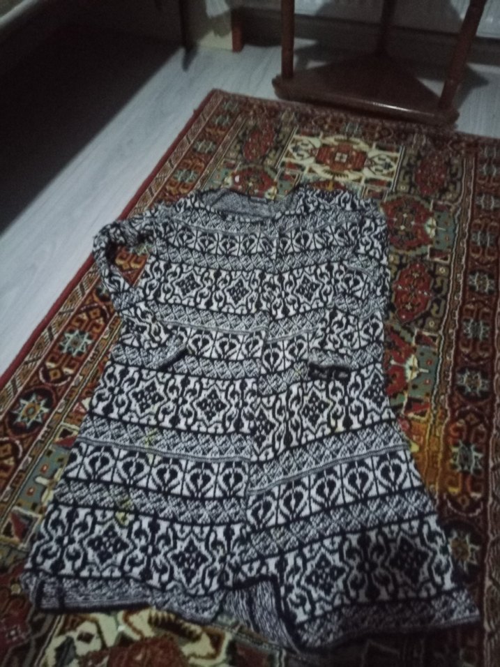 desenli uzun örgü kadın hırka. Salaş kesimi, yuvarlak yaka ve uzun kollarıyla günlük kullanıma uygun bohem tarzı sunar.