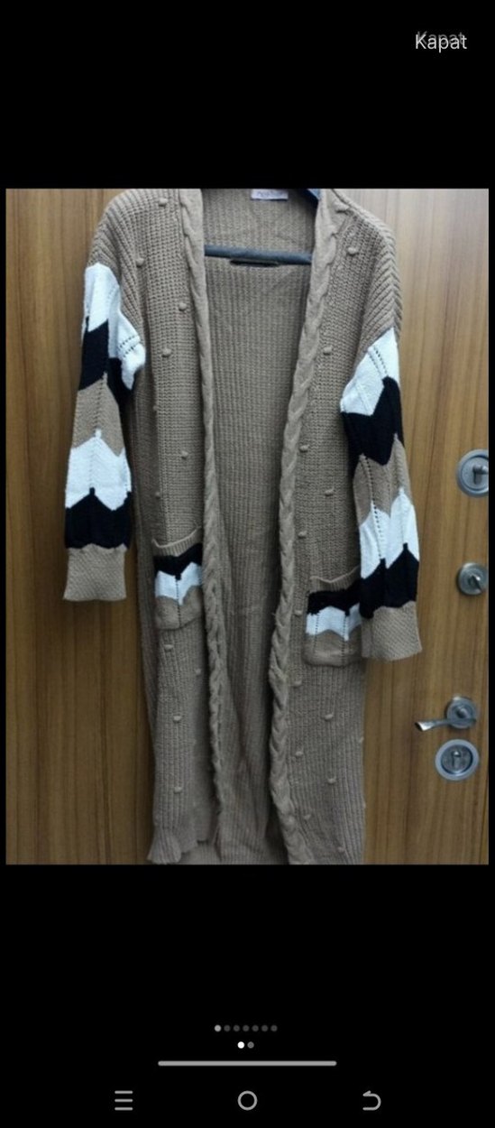 Uzun örgü, bol kesim kadın hırka. Kahverengi üzerine beyaz ve siyah zikzak desenli uzun kollu, atkı yaka detaylıdır.
