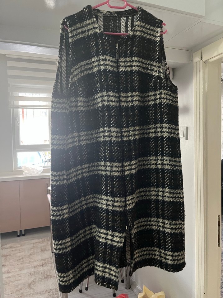 Kolsuz, uzun ve bol kesim kadın yelek. Yumuşak yün kumaştan, gri ekose desenli, örgü dokulu ve günlük kullanıma uygun. Kayra kumaşıdır