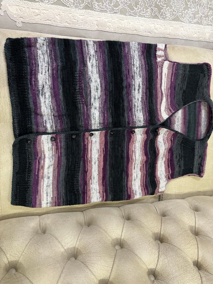 Uzun örme kadın yelek, koyu renkli çok renkli bağcıklı desenli, tekne yaka ve salaş kesimlidir. Kolsuz ve bohem tarzda, günlük kullanıma uygundur.