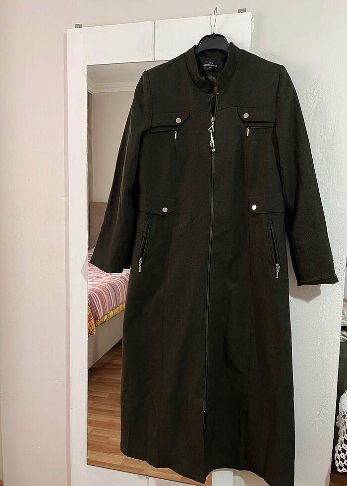Fotoğraflarda görüldüğü üzere detaylı çekim yapılmıştır. İçi ve cepleri astarlıdır. Koyu haki yeşil renktedir. Kumaşından dolayı kol kısımlarında ufak çekilmeler vardır onun dışında defosu yoktur(6. fotoğraf). Cepleri fermuarlıdır. Çok kaliteli bir ürün mevsimlik kullanım için uygundur. İki kol arası (göğüs mesafesi): 38cm boyu(omuzdan itibaren ölçtüm): 128 cmdir.