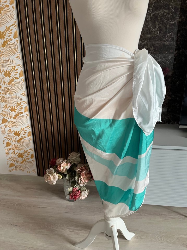 Uzun beyaz pareo, drapeli tasarımı, ince askılı ve hafif batik desenli. Bohem tarzıyla günlük kullanıma uygun, Parisli avangart dokunuşlu.