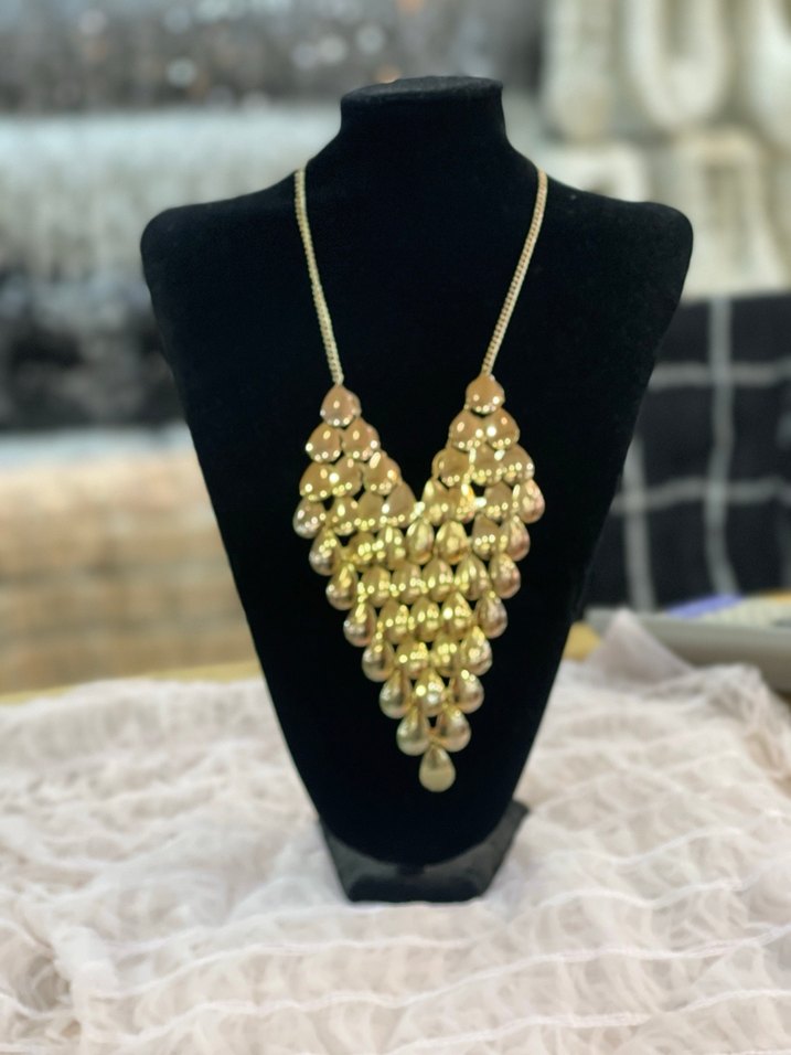 Uzun, parlak altın renkte, boncuklu ve yılan desenli kolye, gösterişli parti kombinleri için uygundur.