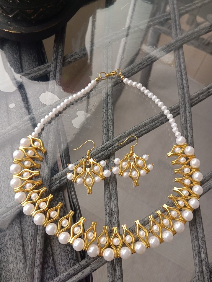 Uzun, parlak altın renkli kolye ve küpe seti, işleme desenli boncuklarla süslenmiştir. Düğün ve özel davetler için uygundur. ✨
