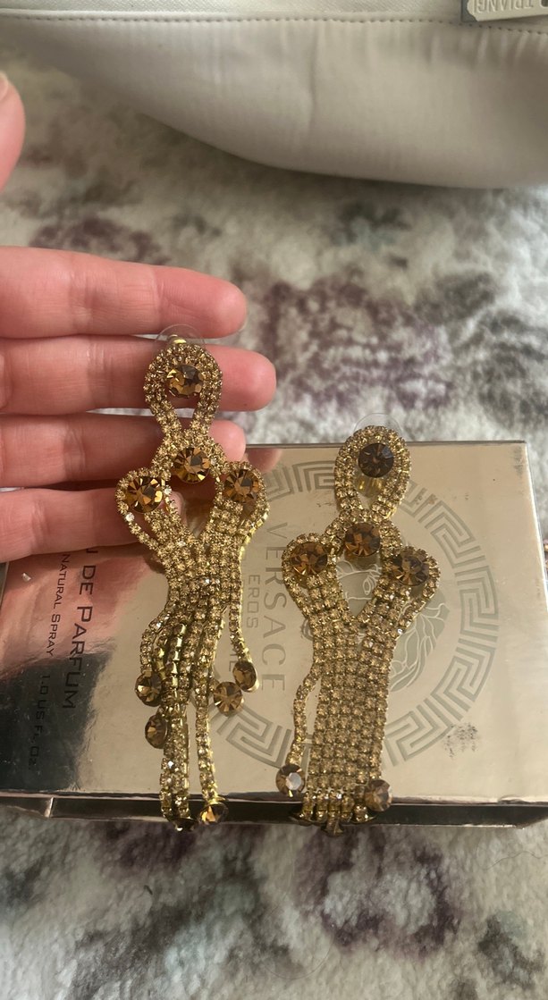 Uzun, parlak payetlerle ve nakışlı desenlerle süslenmiş altın renkli küpe, düğün gibi gösterişli ve şık etkinlikler için uygun. ✨