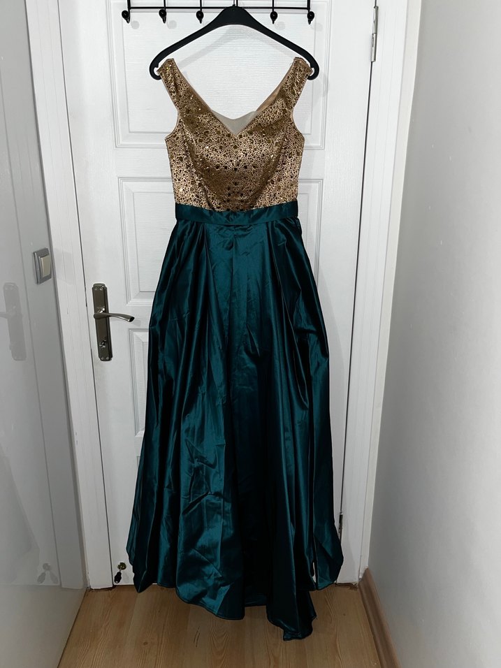 Kadınlar için uzun, straplez ve kolsuz abiye elbise. Parlak altın üst kısmı ve geniş kesim koyu yeşil eteğiyle vintage ve modern klasik tarzı bir arada sunar. ✨