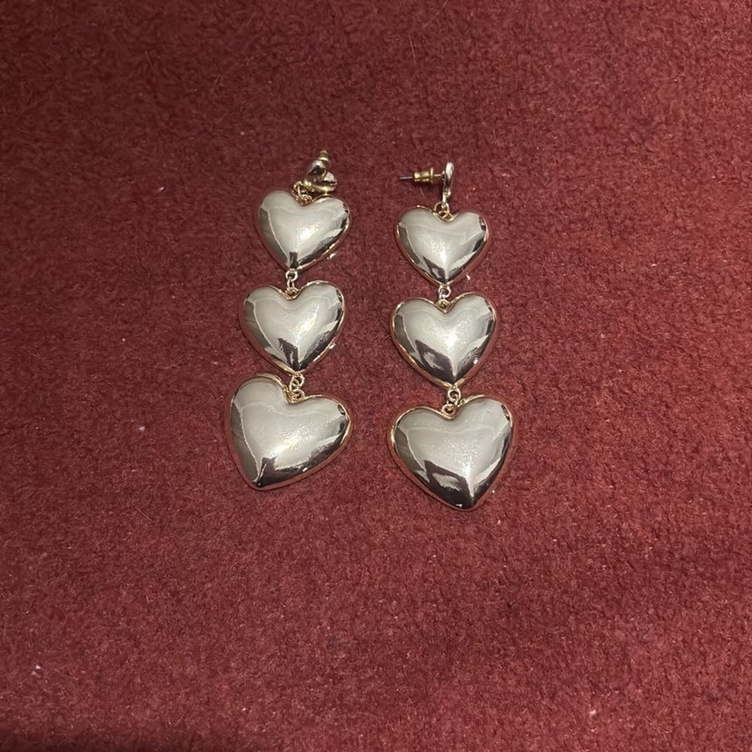 Üç parlak kalp şeklinde düğmeden oluşan uzun, altın renkli küpeler, romantik buluşmalarda cesur ve gösterişli bir tarz sağlar.