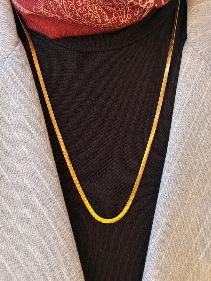 Uzun ve parlak altın renkte, zincir detaylı yılan desenli kolye, cesur ve minimalist tarzı günlük kullanıma sunar. celik ürün