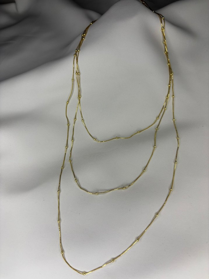 Uzun, parlak altın renkte zincir detaylı bu kolye, minimalist ve bohem tarzıyla günlük kullanıma uygundur. ✨