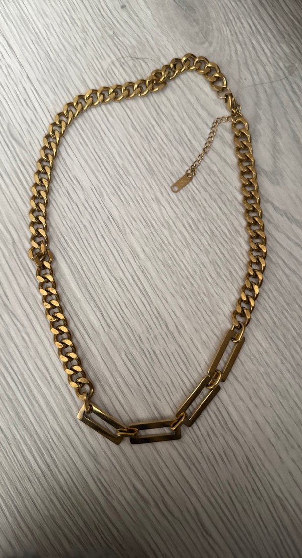 Uzun ve parlak altın zincirden oluşan kadın kolyesi, detaylı halka tasarımına sahiptir. Günlük kullanım için uygundur. ✨çeliktir