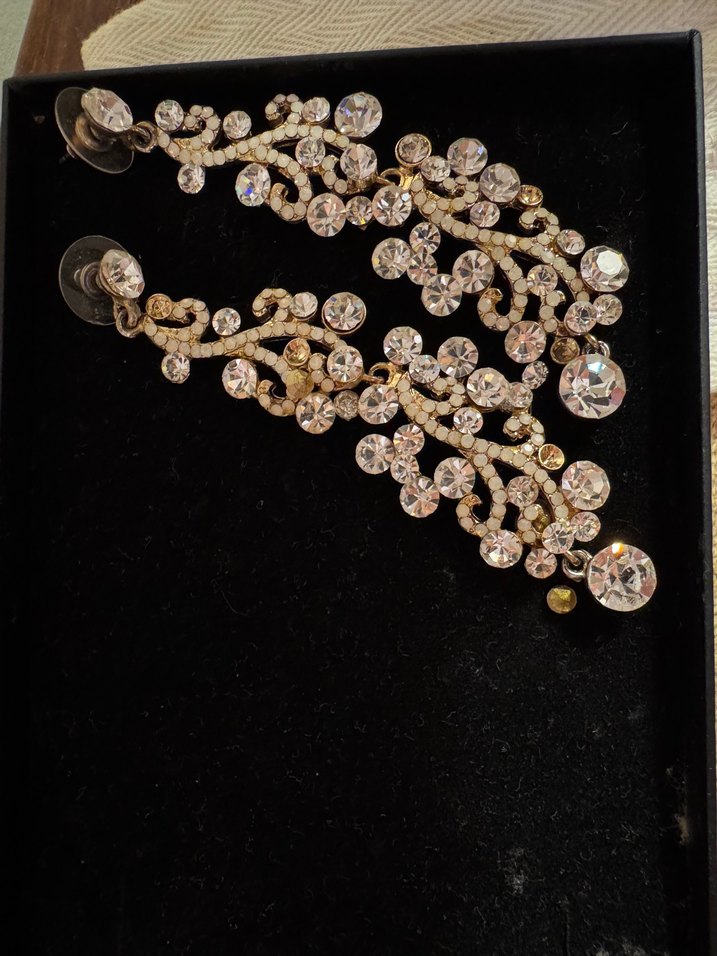 Uzun, desenli ve payetli detaylara sahip altın ve zirkon taşlı renkli küpeler, düğün ve klasik zarafet için uygundur. ✨ Bazı taşları düşük ve kutunun içindedir, bir kuyumcu tarafından yapıştırılması uygundur. Eskiden akmerkez girişinde bulunan mucevherciden alınmıştır