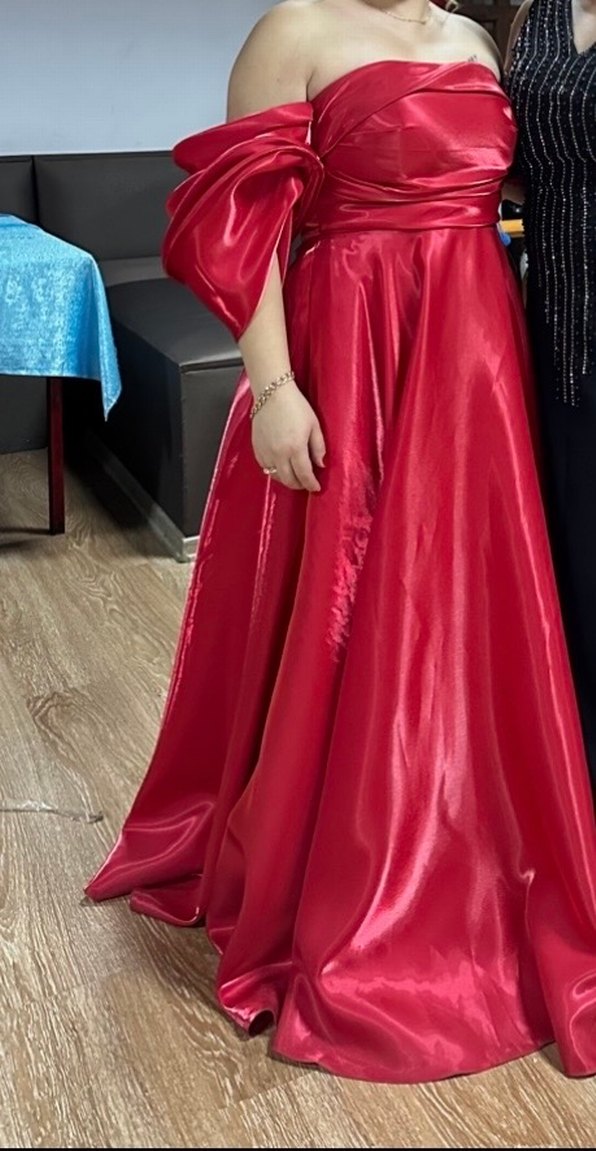 Uzun, vücuda oturan bu abiye elbise, parlak kırmızı kumaş, drapeli tasarım ve kayık yaka ile dikkat çeker. Askılı kolları ve desensiz yüzeyi ile düğünler için uygundur.
