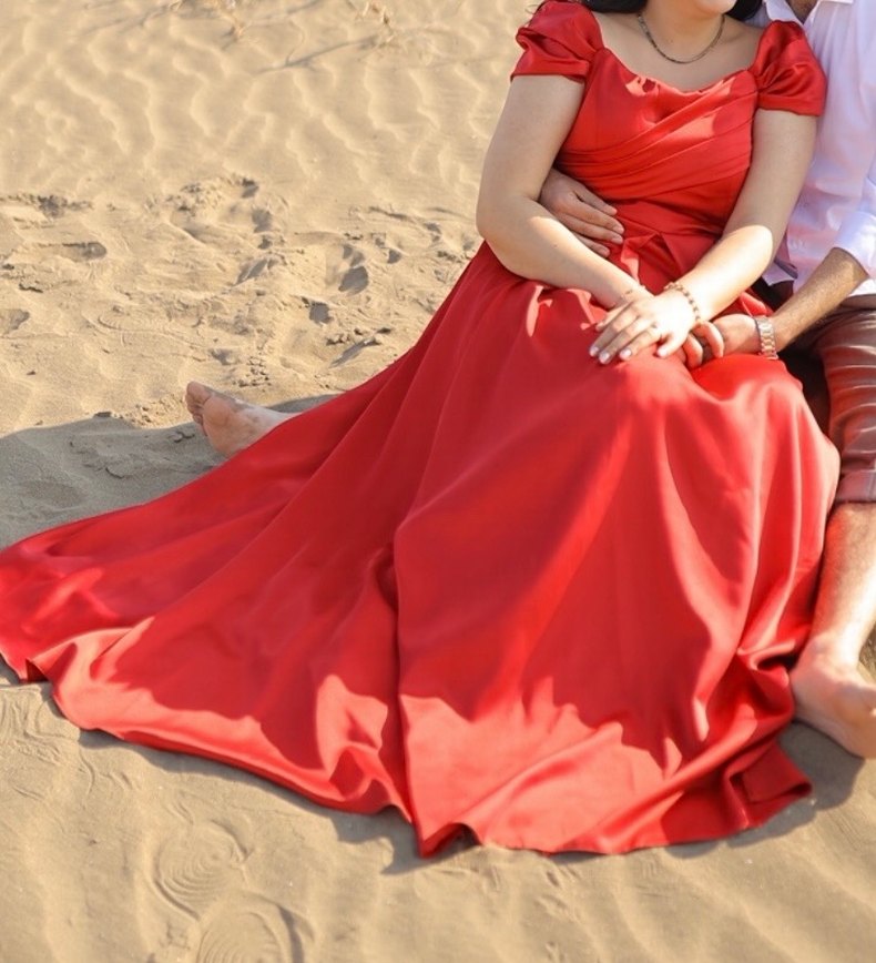 Uzun, dar kesim, parlak kırmızı elbise. Drapeli tasarımı, tekne yaka ve askılı kolları çekimimde giydim. Etek kısmında topuklu ayakkabından kaynaklı bir kaç yırtık var