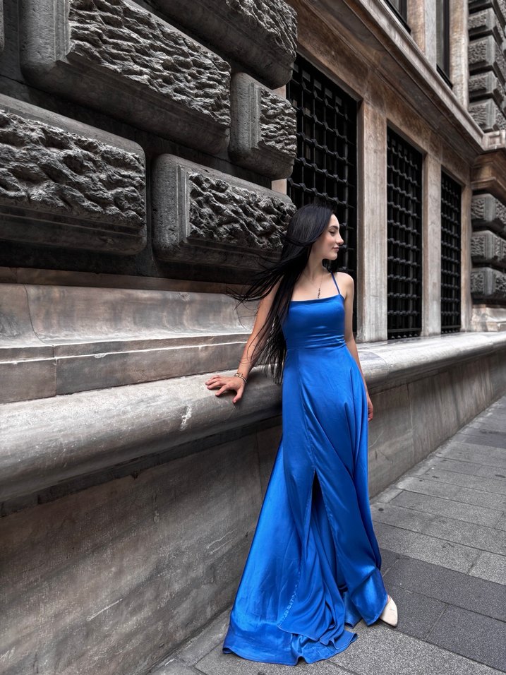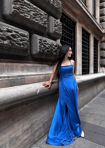 Bu uzun, parlak mavi straplez kadın elbisesi, drapeli ve sırtı bağcıklı tasarımıyla dikkat çeker. Gotik tarzda, cesur ve düğün için uygundur.
