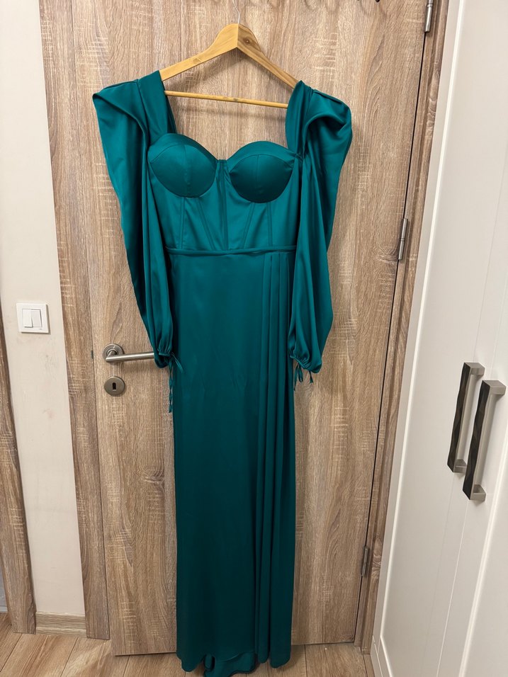 Fitted kesim, uzun ve parlak turkuaz kumaştan yapılmış, straplez yaka ve drapeli uzun kollu abiye elbise. Düğün ve özel davetler için uygundur.