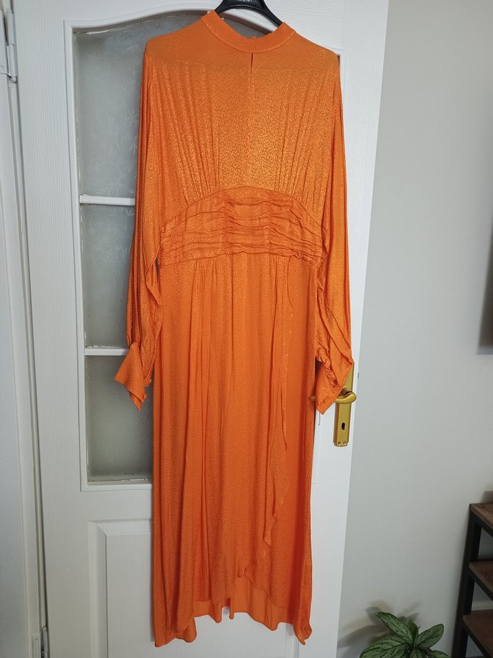 Parlak turuncu keten kumaştan, uzun kollu ve yüksek yakalı, bol kesim, drapeli uzun elbise. Desenli bohem tarzıyla günlük kullanıma uygundur. Fermuar baya uzun giyimi rahat