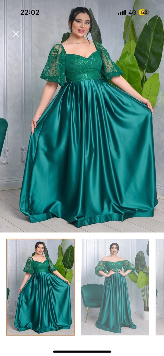 Uzun, bol kesim, parlak yeşil kumaştan drapeli kadın abiye elbise. Dantel pul detaylı kollara sahiptir, düğün ve özel davetler için uygundur. Bir kez giyildi bedenine tam uygun 3xl için daha rahat olabilir küçük göğüs için uygun değil göğüs dekoltesi var. Sorunu yok pulları çok az döküldü kuru temizleme yapılmadı. GİYİLMİŞ OLDUĞUNU HESABA KATARAK satın alalım. Kullanıma engel göze batan hiçbir problemi yok 165-170 boy arasına topuksuz veya çok az topuklu ayakkabıyla giyime uygun olucak şekilde kısaltılmıştır. Yüksek topuklu ayakkabı kullanıcaksanız 160-165 boy aralığına uygundur.