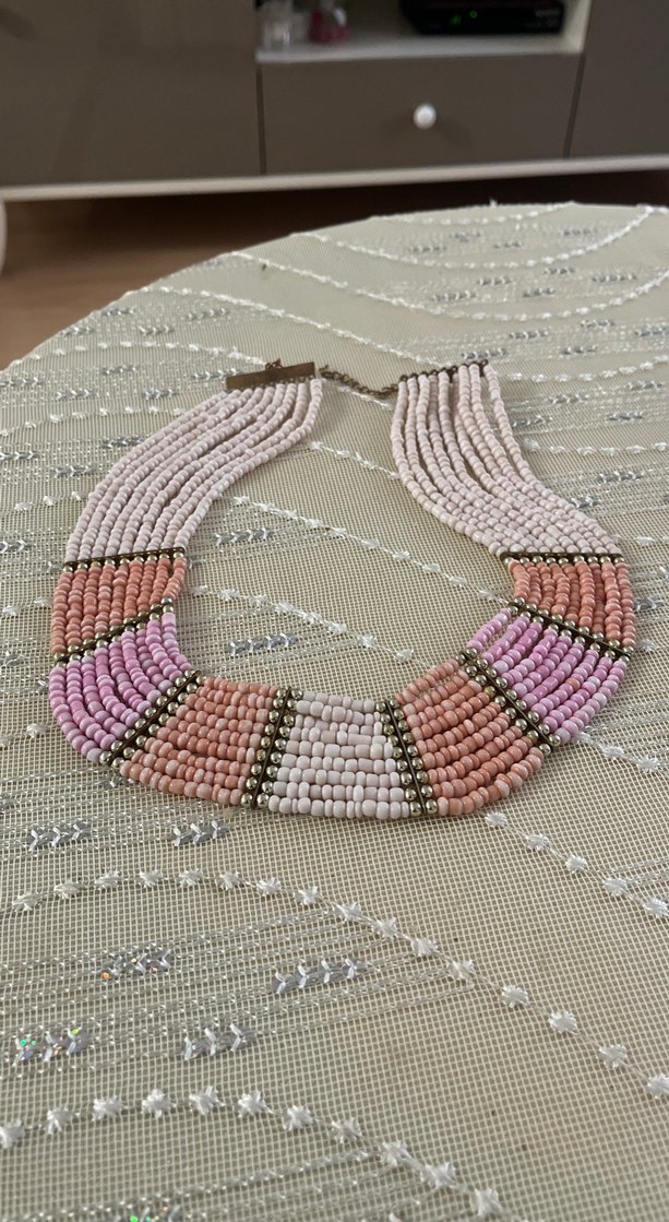 Uzun uzunlukta, pastel renklerde boncuklarla işlenmiş bohem tarzda kolye. Günlük kullanıma uygun, retro ve hippie havası taşır.