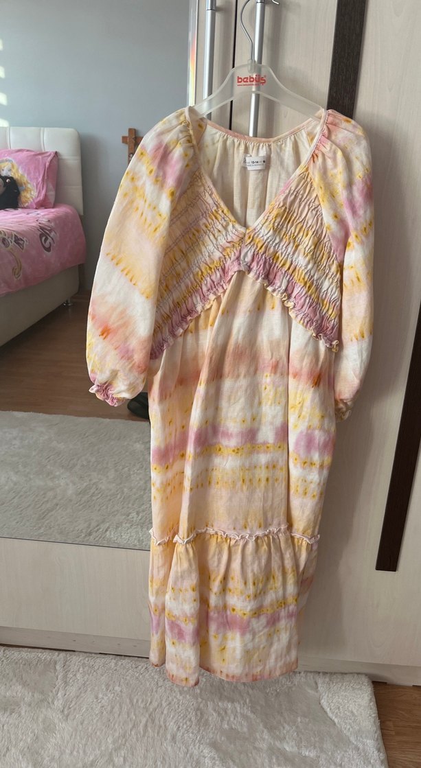 Bu uzun, bol kesim elbise pastel desenleri, fırfır detayları ve tekne yaka ile tasarlanmıştır. Uzun kollu, yumuşak kumaştan yapılmış bohem tarzda bir üründür.