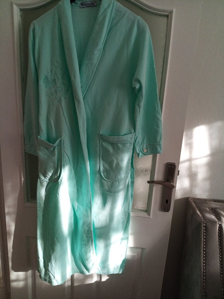 Uzun, pastel yeşil renkte, bol kesim ve uzun kollu kadın sabahlığıdır. İki ön ceplidir ve rahat, bohem tarzda bir kumaşa sahiptir. küçük bir yerinde defosu var resimlere ekledim