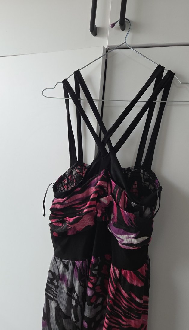 Fitted kesim, çoklu askılı, drapeli ve straplez yakalı bustiyer. Sentetik kumaştan, koyu pembe tie-dye desenli, gotik ve avangard tarza uygun, parti için ideal.