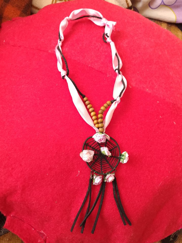 Uzun pembe tie-dye kumaş, ahşap boncuklar ve küçük çiçeklerle süslenmiş bohem bir rüya kapanı kolye. Bohem, hippie tarzına uygun günlük kullanıma uygun. ürün tek özel üretim tasarım