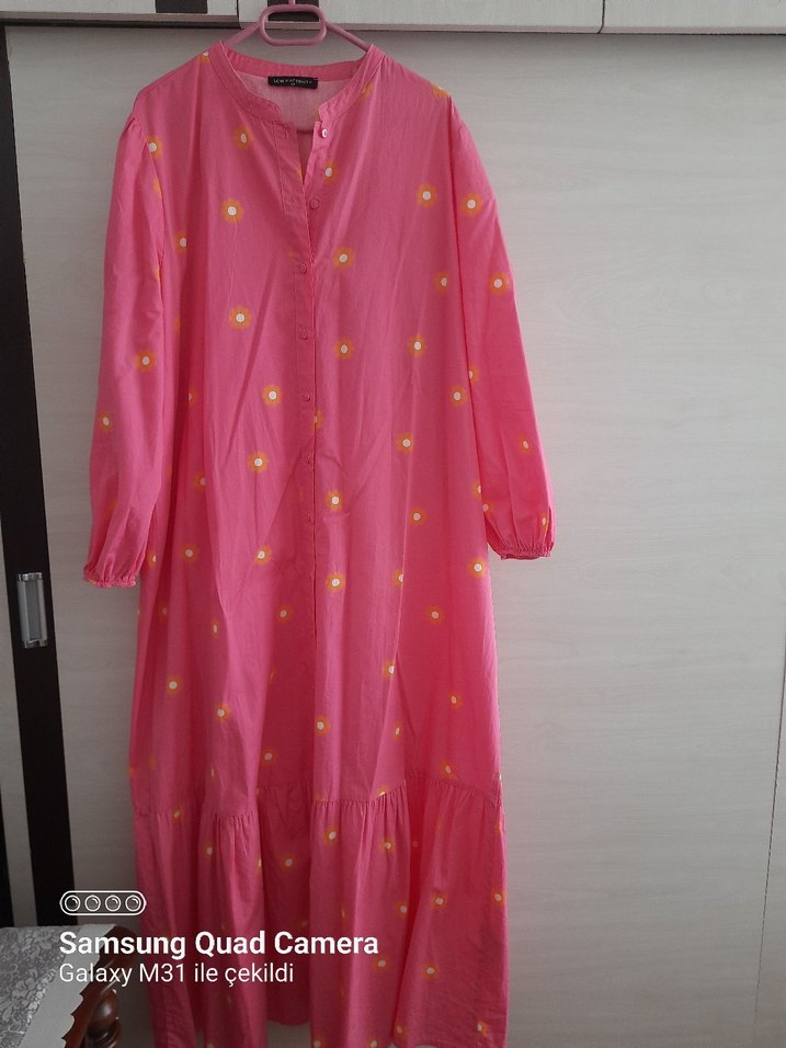 Pembe renkte, düğmeli ve uzun, bol kesim elbise. Uzun kollu , yumuşakpamuklu kumaştan yapılmıştır. Bohem tarzda.