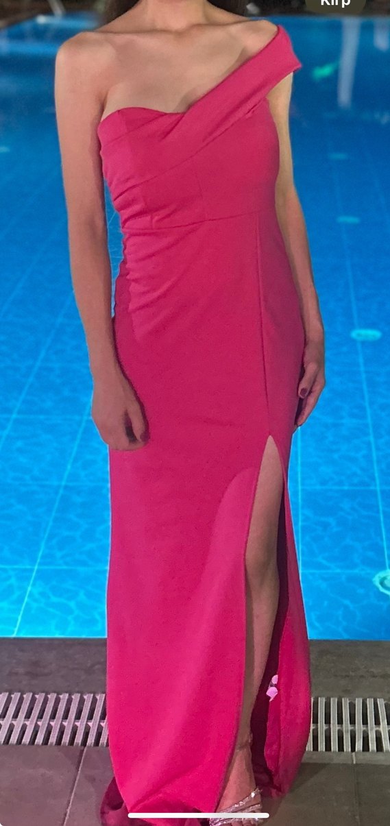 Bu pembe uzun elbise, straplez ve drapeli tasarımıyla bacak dekoltesi sunar. Cesur ve modern tarzıyla romantik akşamlar için uygundur.