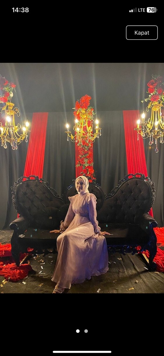 Uzun, vücuda oturan kadın elbisesi yüksek yakalı ve askılı kolludur. İpek gibi kumaştan yapılmış, etnik desenli ve drapeli, modest avant-garde tarzda düğün için uygundur.